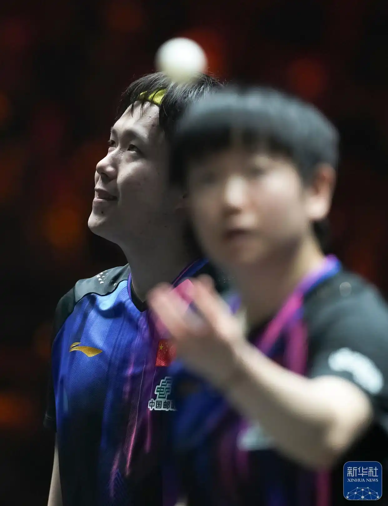 ↑ 王楚钦/孙颖莎(前)在比赛中。