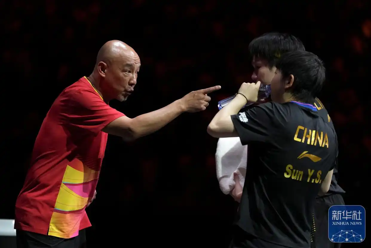 ↑ 王楚钦(右后)/孙颖莎(右前)在比赛间隙接受教练肖战的指导。