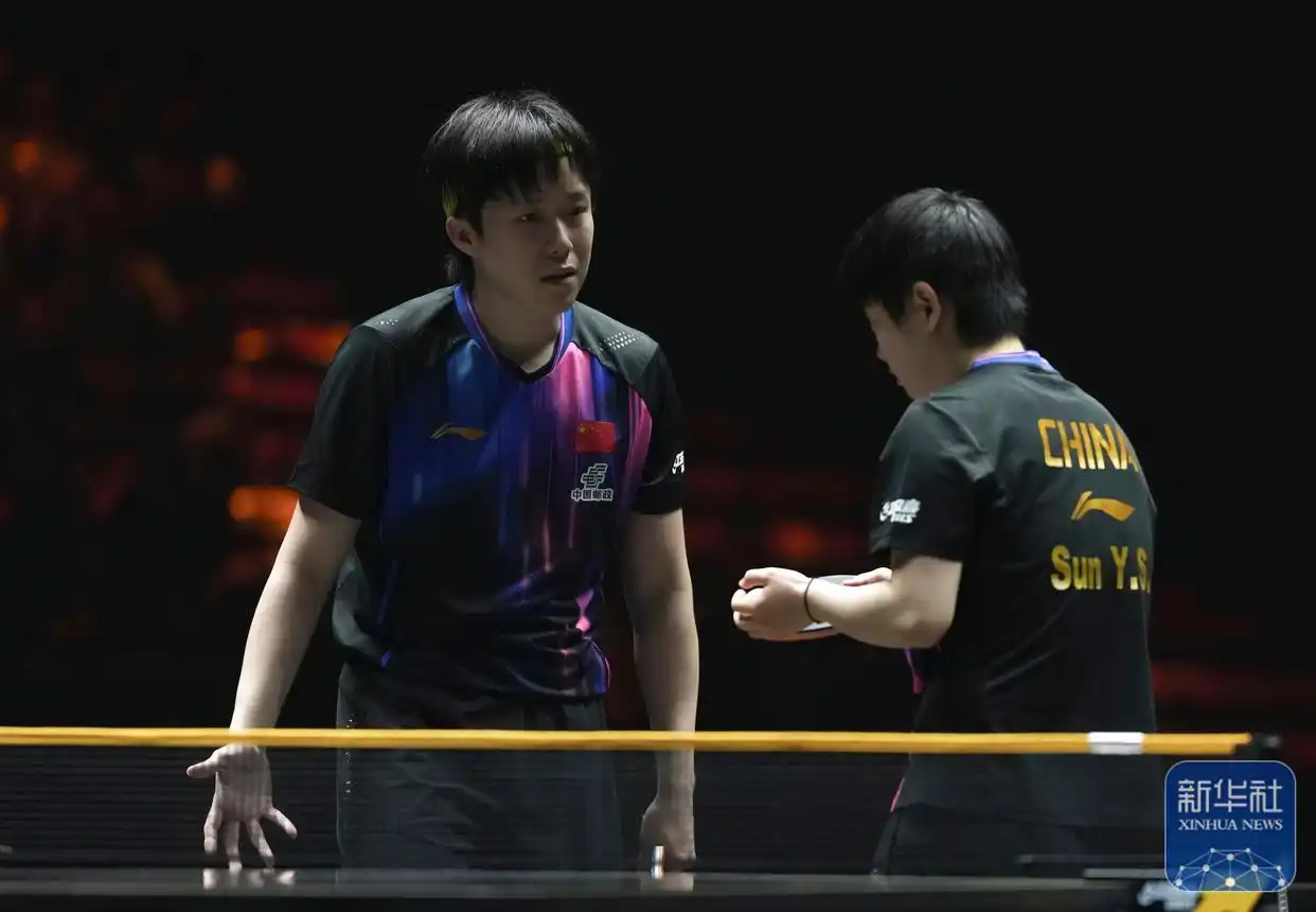 ↑ 王楚钦(左)/孙颖莎在比赛中交流战术。