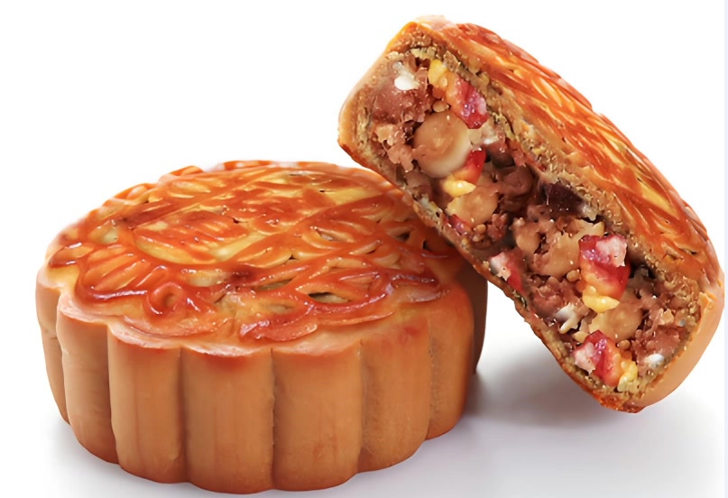 4、滇式:五仁馅料中常加入云南当地特产的宣威火腿丁,形成独特的甜咸口味。火腿的咸香与果仁的香甜相互融合,是滇式五仁月饼的一大特色。