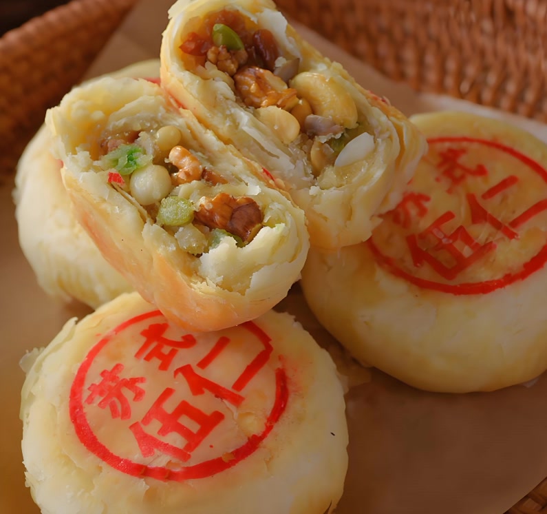 3、苏式:口味香甜,玫瑰、桂花等花香与果仁的香味相互交织,酥皮的酥脆口感与馅料的软糯形成对比,风味独特。
