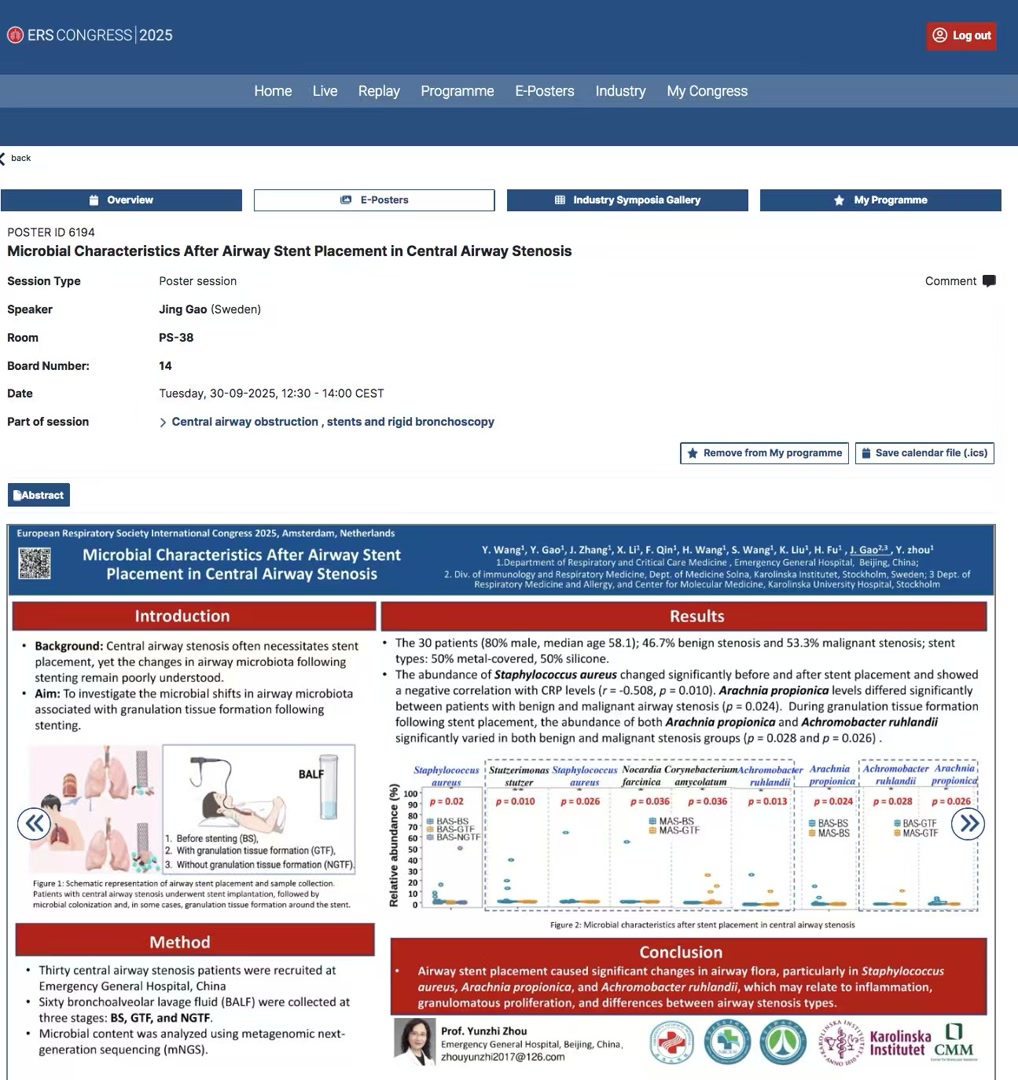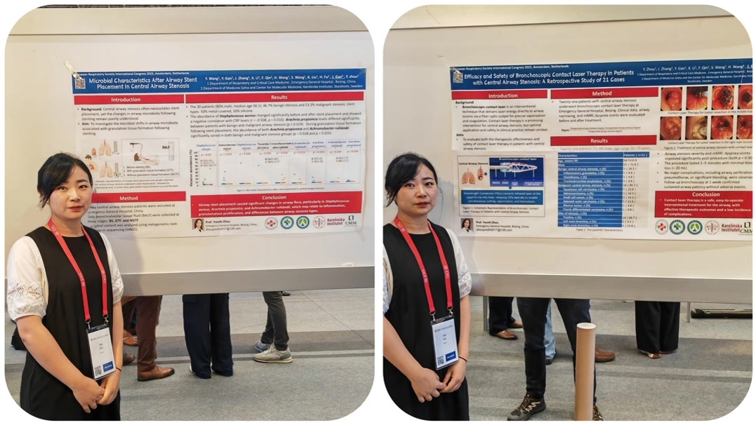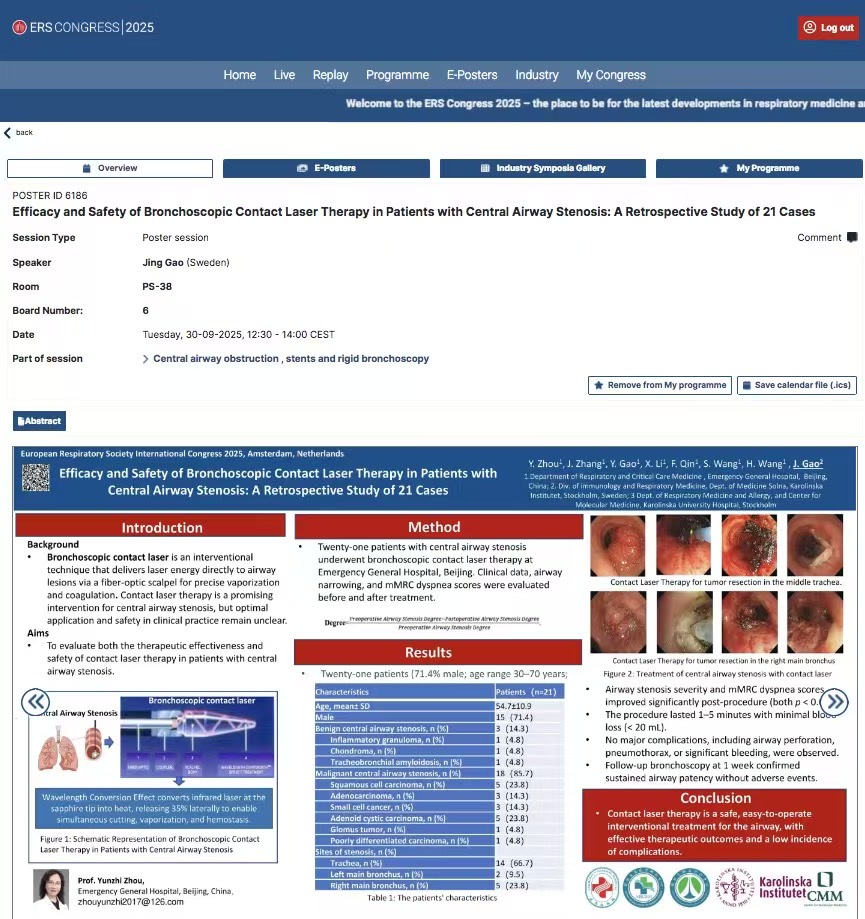 2025年9月30日,应急总医院(北京)呼吸与危重症医学科主任周云芝团队携两项前沿研究亮相大会,聚焦中央气道狭窄这一全球呼吸介入难题。周主任团队提出了系统化的临床解决方案及基于分子学研究的精准治疗策略,包括研究《Efficacy and Safety of Bronchoscopic Contact Laser Therapy in Patients with Central Airway Stenosis: A Retrospective Study of 21 Cases》和《Microbial Characteristics After Airway Stent Placement in Central Airway Stenosis》。两项研究均与瑞典卡罗林斯卡医学院呼吸科紧密合作,搭建了国际化介入治疗平台,向全球呼吸领域专家展示了中国团队在肺部介入治疗方面的最新成果,获得国际同行高度关注与认可。