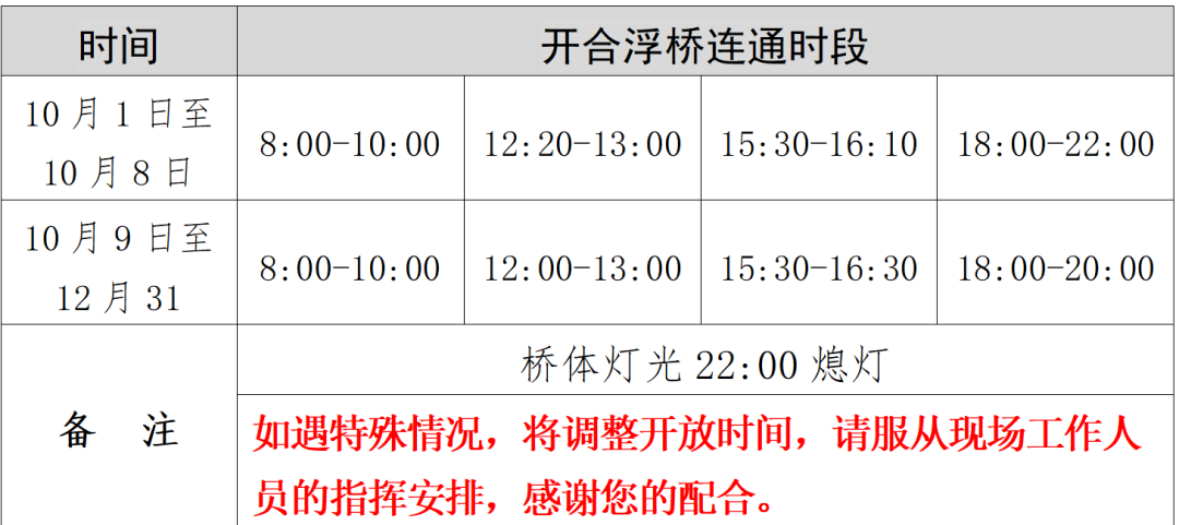 2.东风坝浮桥在试运营期间,每日开放时间为08:00至20:00。为统筹船舶通航与行人通行需求,浮桥将在此期间分时段连通,具体安排如下:
