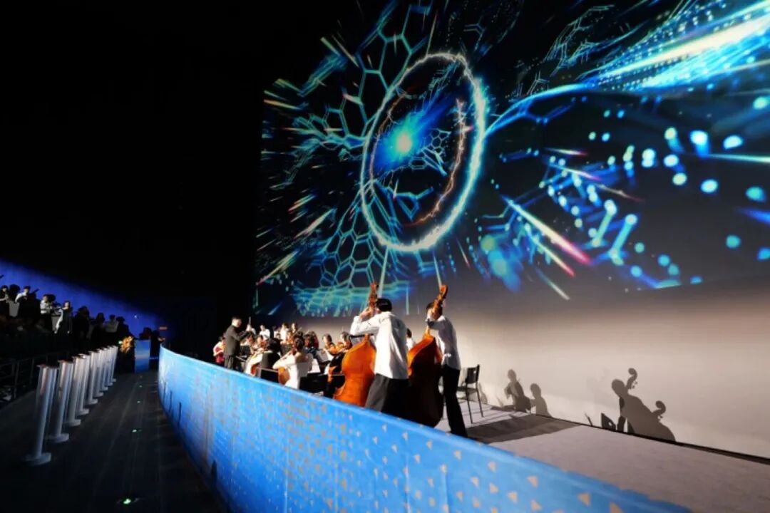 大会由中国计算机学会(CCF)主办,CCF计算艺术分会与山东艺术学院联合承办。开幕式上,山东艺术学院青年交响乐团演奏了《欢迎》和《千里江山图》两首由AI作曲的交响乐,创新的音乐作品与IMAX巨幕影画结合,直观诠释了“人工智能重塑艺术边界”的主题内涵。