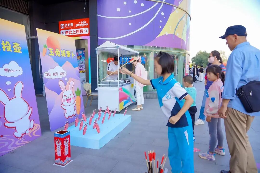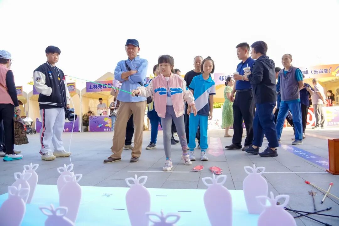 广场西侧的互动游戏区同样热闹非凡,玉兔拔萝卜、投壶等传统游戏吸引了老中青少各年龄段居民踊跃参与,欢声笑语此起彼伏。集章打卡活动更是备受青睐,居民们手持集章卡穿梭于各个活动点位,认真收集印有“科技、和谐、文明、健康、绿色”云岗标志的特色印章。