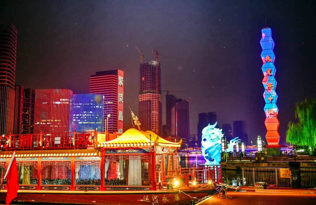 在运河奥体公园内的二号码头乘坐游船,欣赏副中心的绝美夜景。