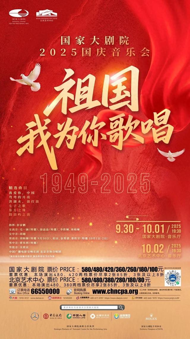 为庆祝中华人民共和国成立76周年,国庆期间,《祖国,我为你歌唱——国家大剧院2025国庆音乐会》将在国家大剧院音乐厅与北京艺术中心音乐厅震撼唱响。