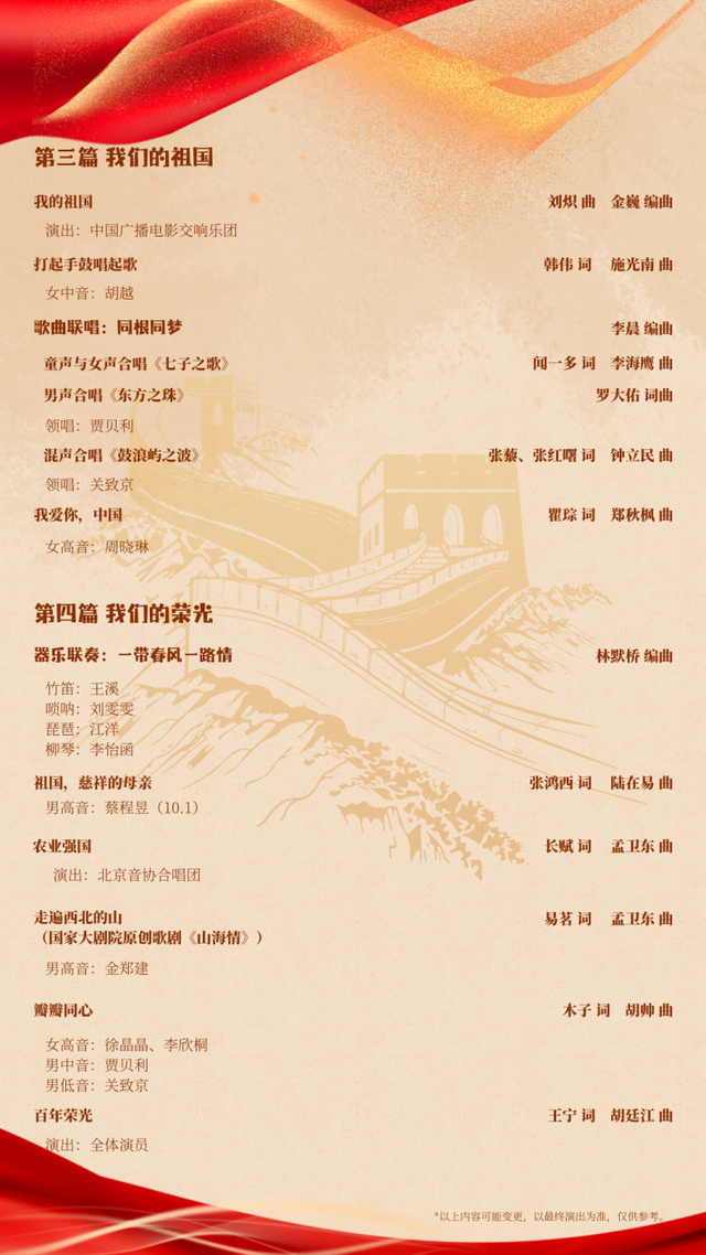 音乐会以《我们的家乡》《我们的青春》《我们的祖国》《我们的荣光》为四大篇章,将通过大气磅礴的旋律与深情动人的歌声,引领观众回望76年岁月变迁,礼赞新时代中国的蓬勃活力,传递珍惜当下、奋进未来的精神力量,凝聚起推动中华民族伟大复兴的磅礴伟力。