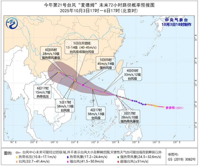 预计“麦德姆”将以每小时25~30公里左右的速度向西偏北方向移动,并将于5日白天在广东电白到海南万宁一带沿海登陆,登陆时强度为台风级或强台风级,登陆后强度逐渐减弱,并继续向西北方向移动,预计6日夜间台风低压中心到达云南南部。