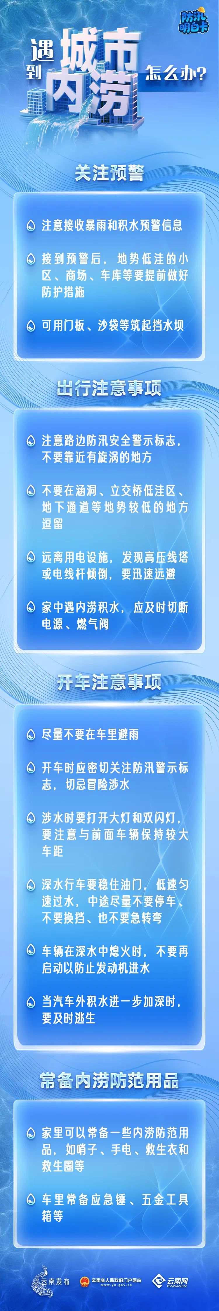 1、本次过程与前期两个台风过程强降雨落区重叠,曲靖市南部、文山州、红河州、普洱市南部、西双版纳州、临沧市、德宏州、保山市的暴雨灾害风险较高,需做好塘堰、水库、中小河流及山洪易发区、地质灾害危险区等敏感地区的监测和巡查,加强防范城市暴雨积涝、中小河流洪水、山洪灾害和地质灾害。
