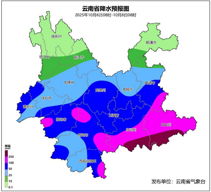 据云南省气象台消息,台风“麦德姆”将于10月5日白天在广东电白到海南万宁一带沿海登陆,登陆时强度为台风级或强台风级,并向西北方向移动,台风中心逐渐趋向云南省。受台风低压影响,预计10月6日至7日,云南中部和南部将出现中到大雨局部暴雨、大暴雨,其中曲靖市南部、文山州、红河州、普洱市东部、西双版纳州东部、临沧市有大到暴雨局部大暴雨。过程累计雨量50~80毫米,局地100~150毫米,文山州南部、红河州南部局地可达250毫米以上,最大小时雨量50~60毫米。本轮强降雨与前期两个台风强降雨落区重叠,山洪灾害和地质灾害气象风险等级较高。同时10月6日至7日正值国庆假期尾声和返程高峰,强降雨将对云南的旅游、交通造成不利影响。