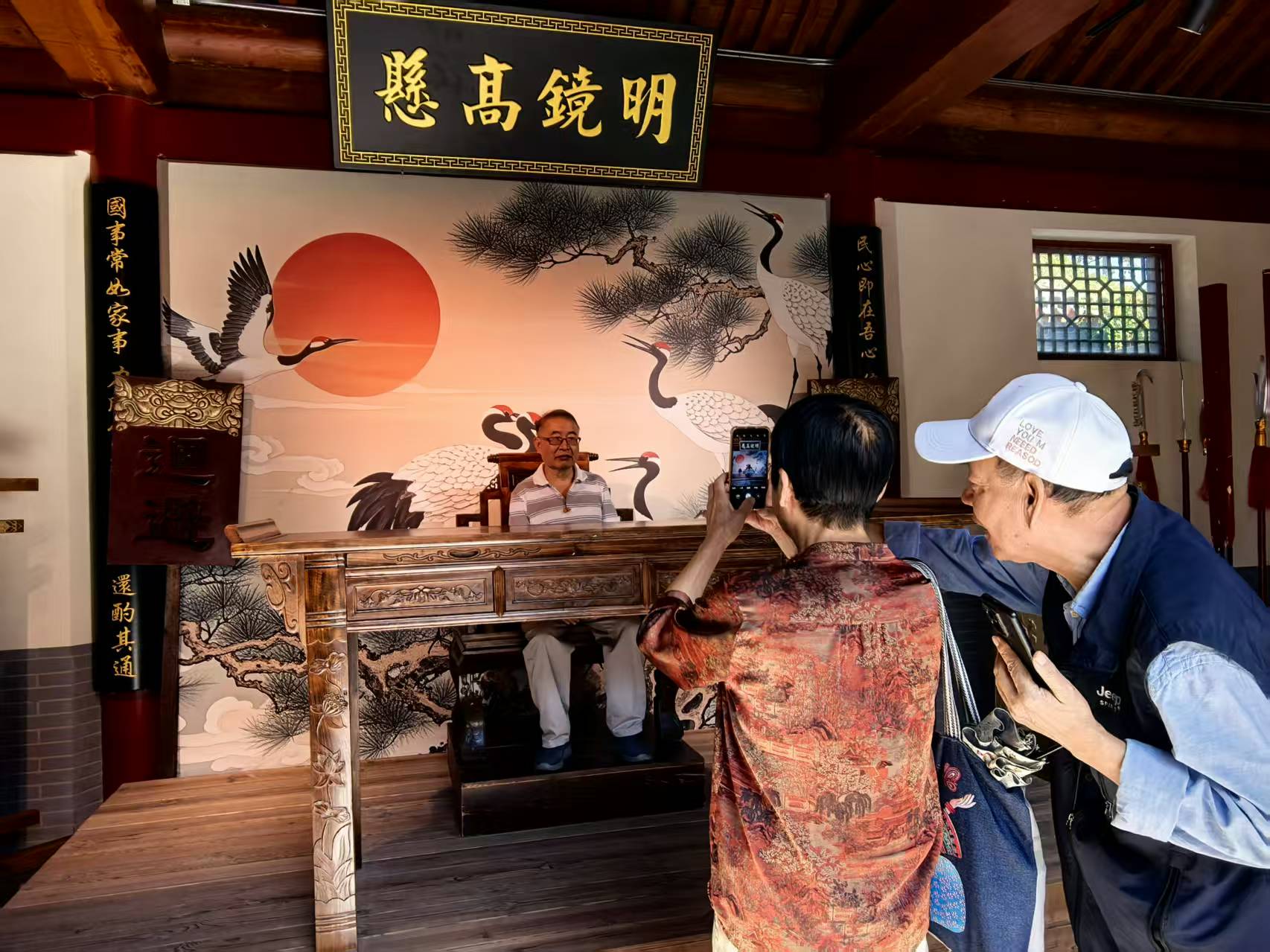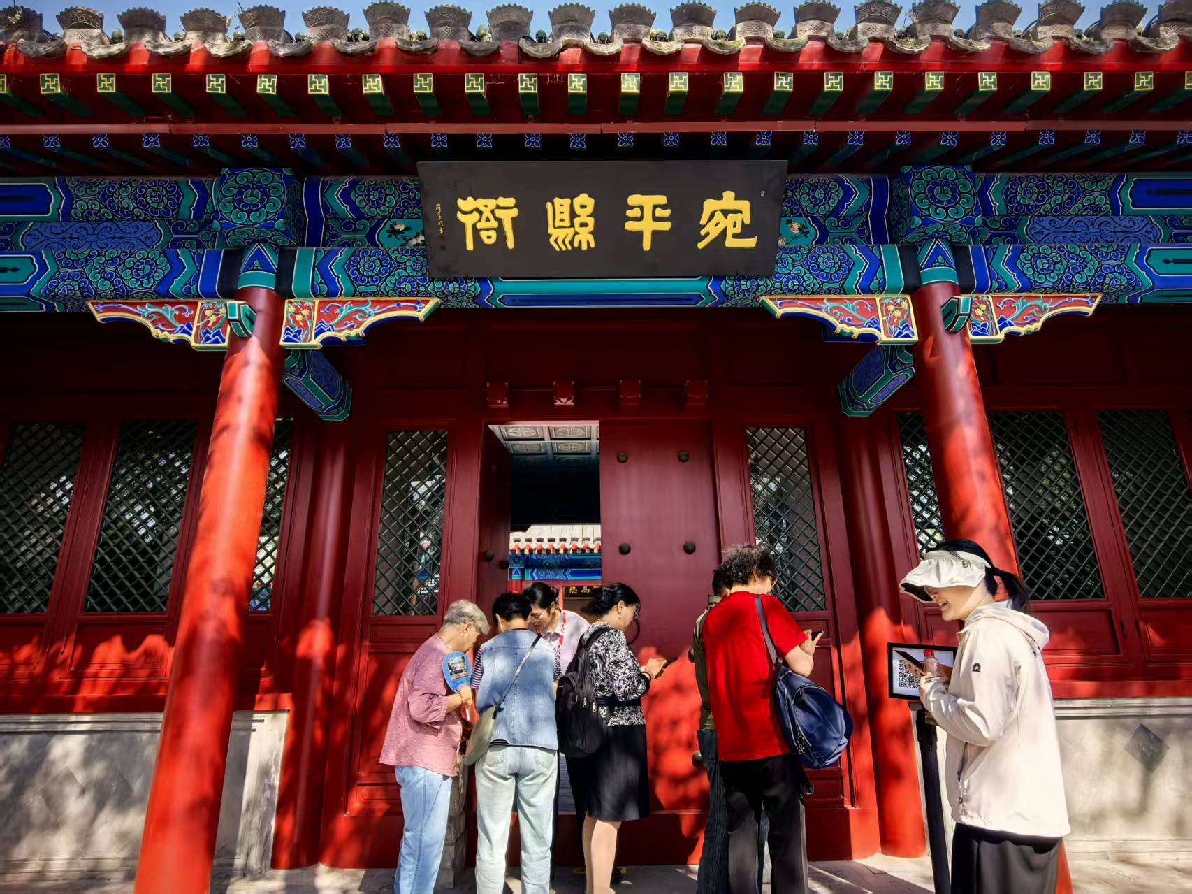 “十一”假期期间,宛平县衙再次翻新面向公众开放。从宛平县衙一进门,县衙大堂的复原场景便映入眼帘,古朴案几庄严威立,“明镜高悬”匾额高挂中央,刀枪兵器林立两侧,往昔官员断案的肃穆画面仿佛呈现在眼前,历史厚重感扑面而来。不少游客端坐在大堂中央,沉浸式体验了一把“清官断案”,更有NPC县长“现身”,让宛平县衙“复苏”。