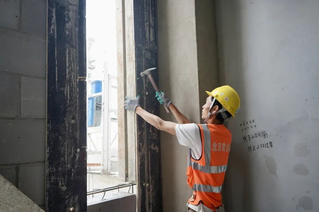 不远处,木工刘小虎正蹲在钢架旁专注地调整模板。43岁的他来自陕西,有着十年木工经验。国庆期间,他和工友们的工作节奏依旧紧张,忙着支梁、合墙柱模板。“国庆跟平时节奏差不多,但心里的劲儿更足,我们早一天把模板支好,这学校就能早一天建成。”刘小虎说道。谈及家人,他坦言:“肯定想家,但看着大楼在自己和工友们的努力下一天天建高,心里特别有成就感。”说着,他翻出手机里儿子的视频:“娃知道我是盖房子的,还说‘爸,你盖的楼肯定特别结实’。等这学校建好了,我一定带他来看看。”