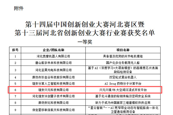 近日,山东外事职业大学元宇宙研究院孵化的企业雄安兴元科技有限公司(简称:雄安兴元),在第十四届中国创新创业大赛河北赛区暨第十三届河北省创新创业大赛行业赛中,凭借“兴元兴境VR大空间沉浸式开发平台”项目获得一等奖,并入围全国赛。河北省科技创新服务中心、工业和信息化部火炬高技术产业开发中心都公示了大赛全国赛入围企业名单。
