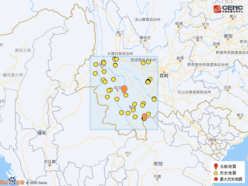 周边县城:震中距景谷傣族彝族自治县38公里、距临翔区43公里、距镇沅彝族哈尼族拉祜族自治县69公里、距双江拉祜族佤族布朗族傣族自治县74公里、距云县83公里,距临沧市42公里,距昆明市267公里。