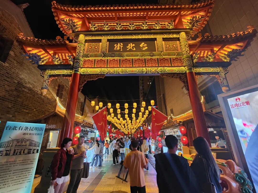 夜幕降临,昆明台北街上空数百盏“福”字灯笼随风摇曳。光影流转间,这条短短一百多米的街道不仅串起了两座城的烟火,更暖了两岸一家人的心。