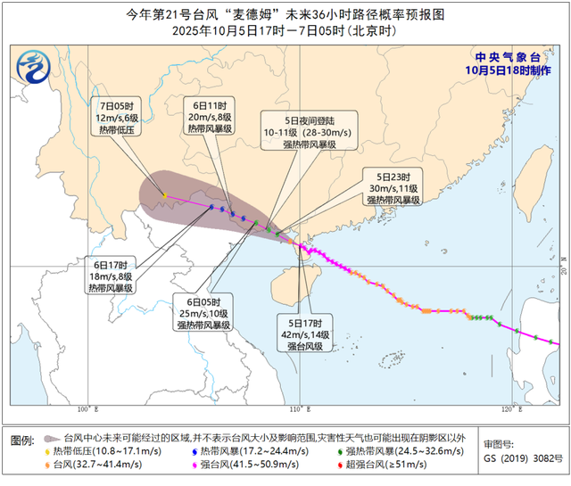 今夜到明天,风雨核心区将转移至广西南部,风雨强度在历史同期较为少见。中央气象台今晚18时发布台风橙色预警。预计,“麦德姆”强度将逐渐减弱,并将今天夜间在广西防城港至中越边界一带沿海再次登陆(强热带风暴级,10至11级,28至30米/秒)。