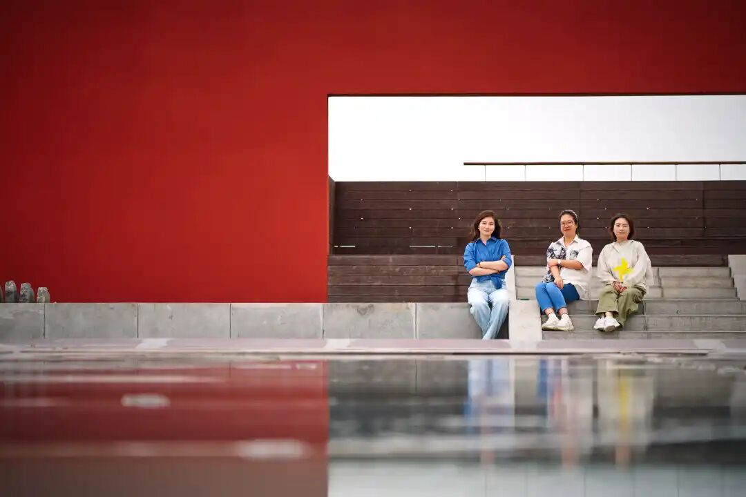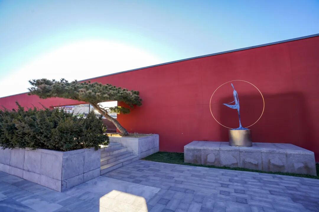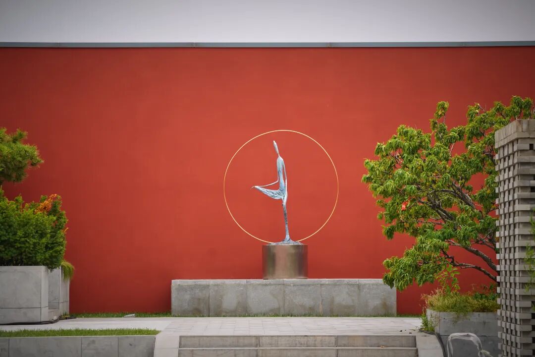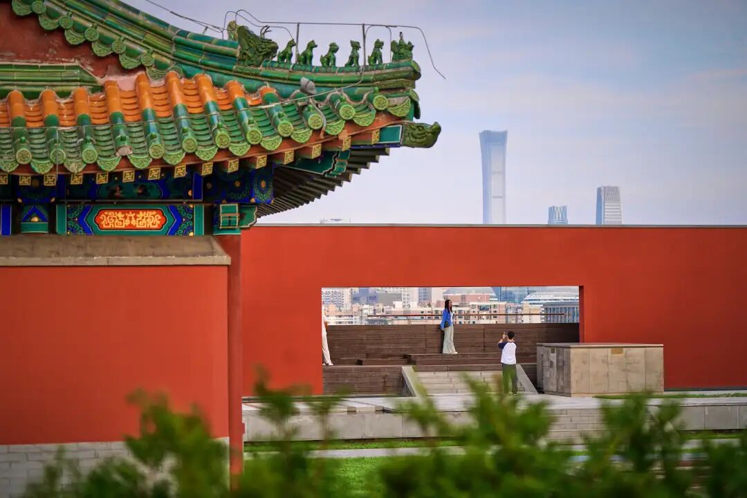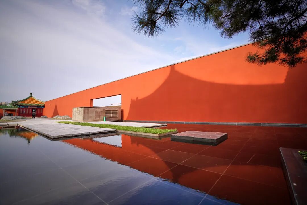 红墙与现代金属结构交织