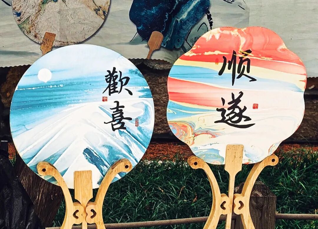 走进颐和园“颐和风华录”市集,雅致的水墨风扑面而来。两把寓意美好的漆扇在市集里格外吸睛——清蓝水墨的“欢喜”扇面,如同悬着一轮圆月,红橙交织的“顺遂”扇面笔锋灵动,不少游客对着扇面默念祝福,再用手机记录下这份美好,还会特意搭配周边的廊亭、绿植取景,让照片既有节日氛围,又藏着颐和园的古典韵味。
