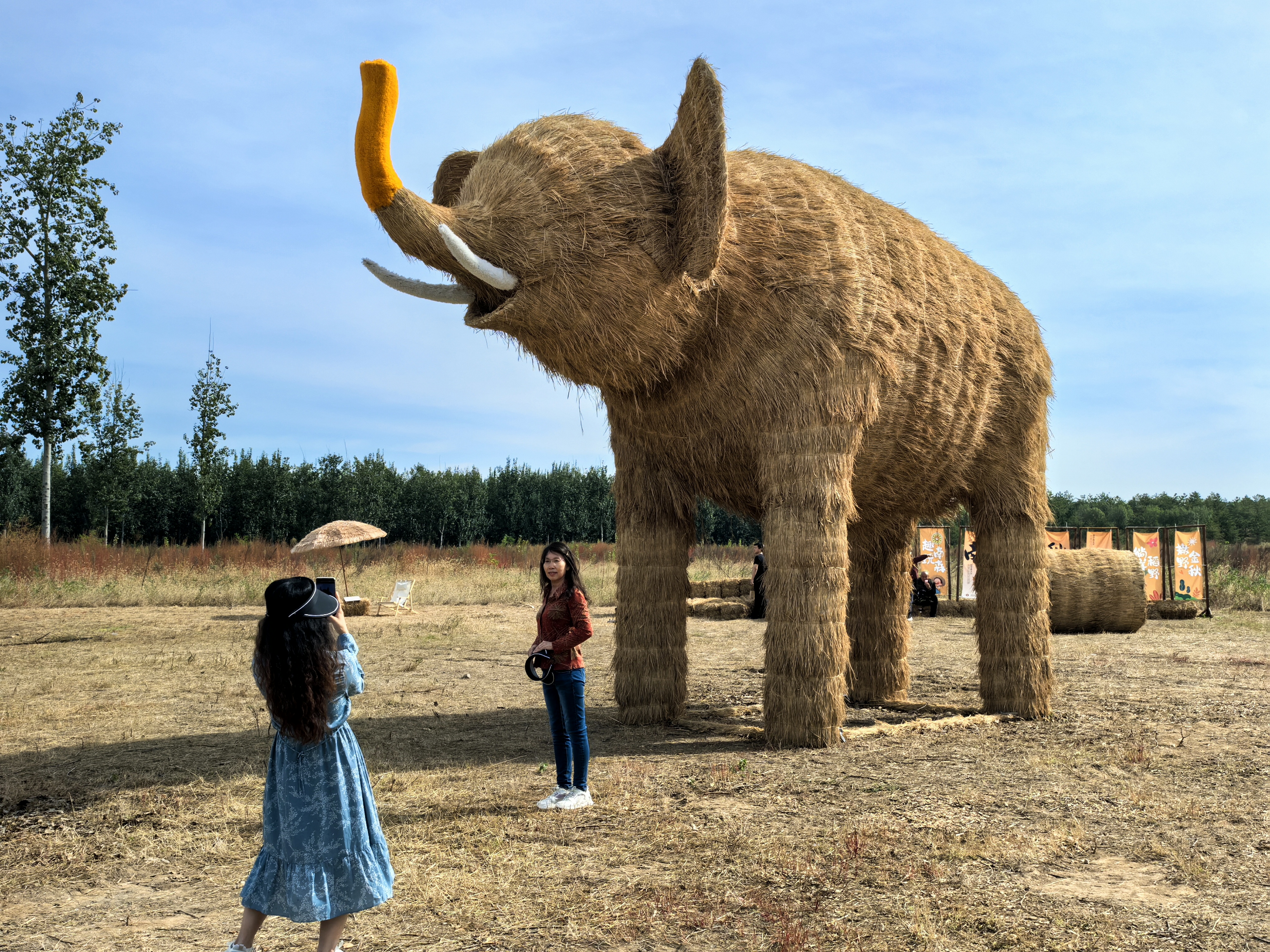 走进燕景台山下草坪,浓郁的田园气息扑面而来。5 米高的稻草大熊格外引人注目,它蹲坐在草坪中央,圆滚滚的身躯、憨态可掬的表情,热情迎接每一位游客;旁边的稻草麋鹿身姿挺拔,虬劲的鹿角对称规整,细节刻画精致,宛如从古代猎苑中走来;各类稻草珍禽更是形态各异,还有稻草野猪灵动鲜活、稻草大象圆润厚实、稻草狐獴“吃瓜”即视感再现……此次活动以稻草为原料,编织出造型各异的动物造型,生动再现了皇家猎苑中百兽齐聚、生机盎然的场景。