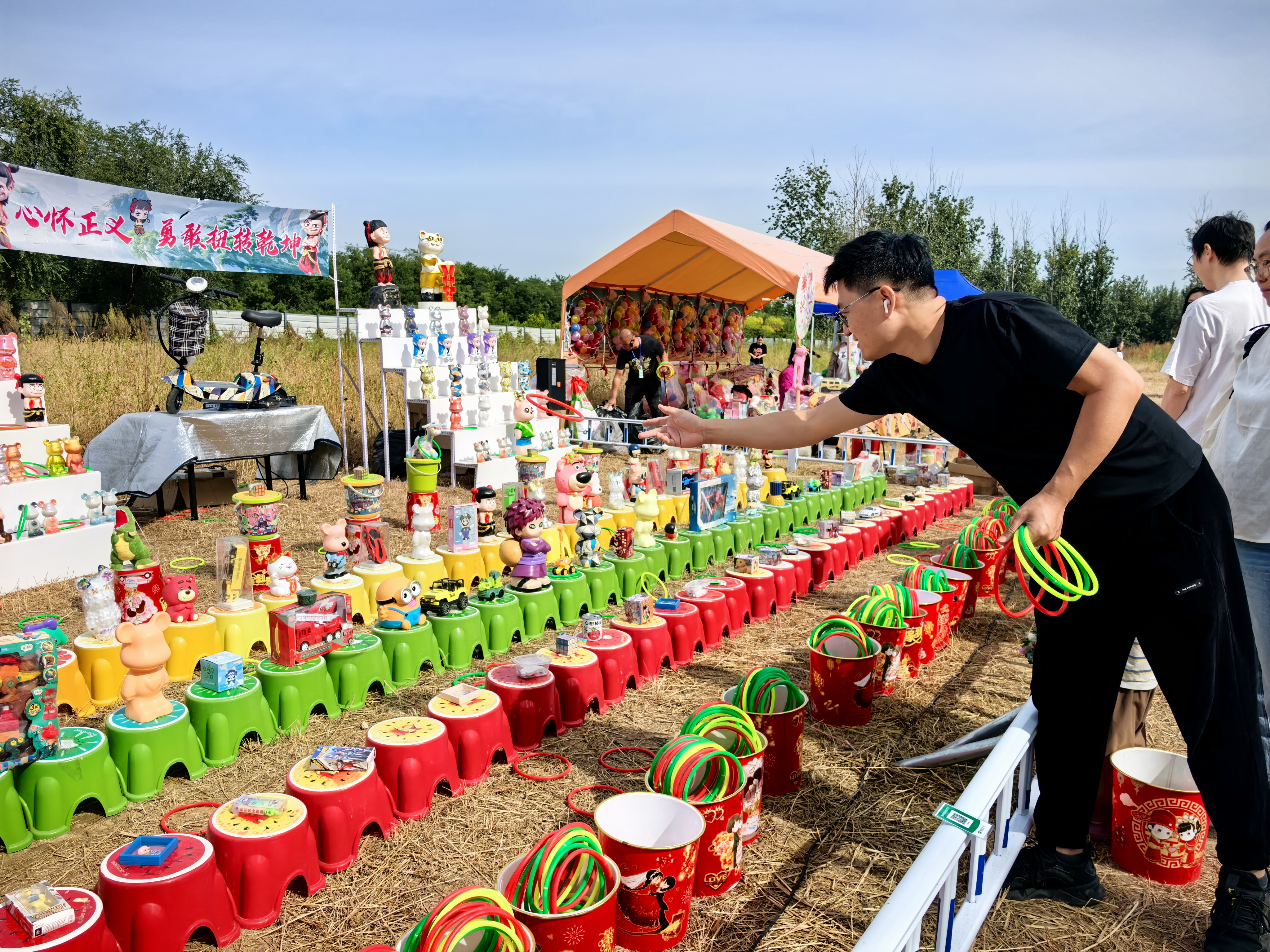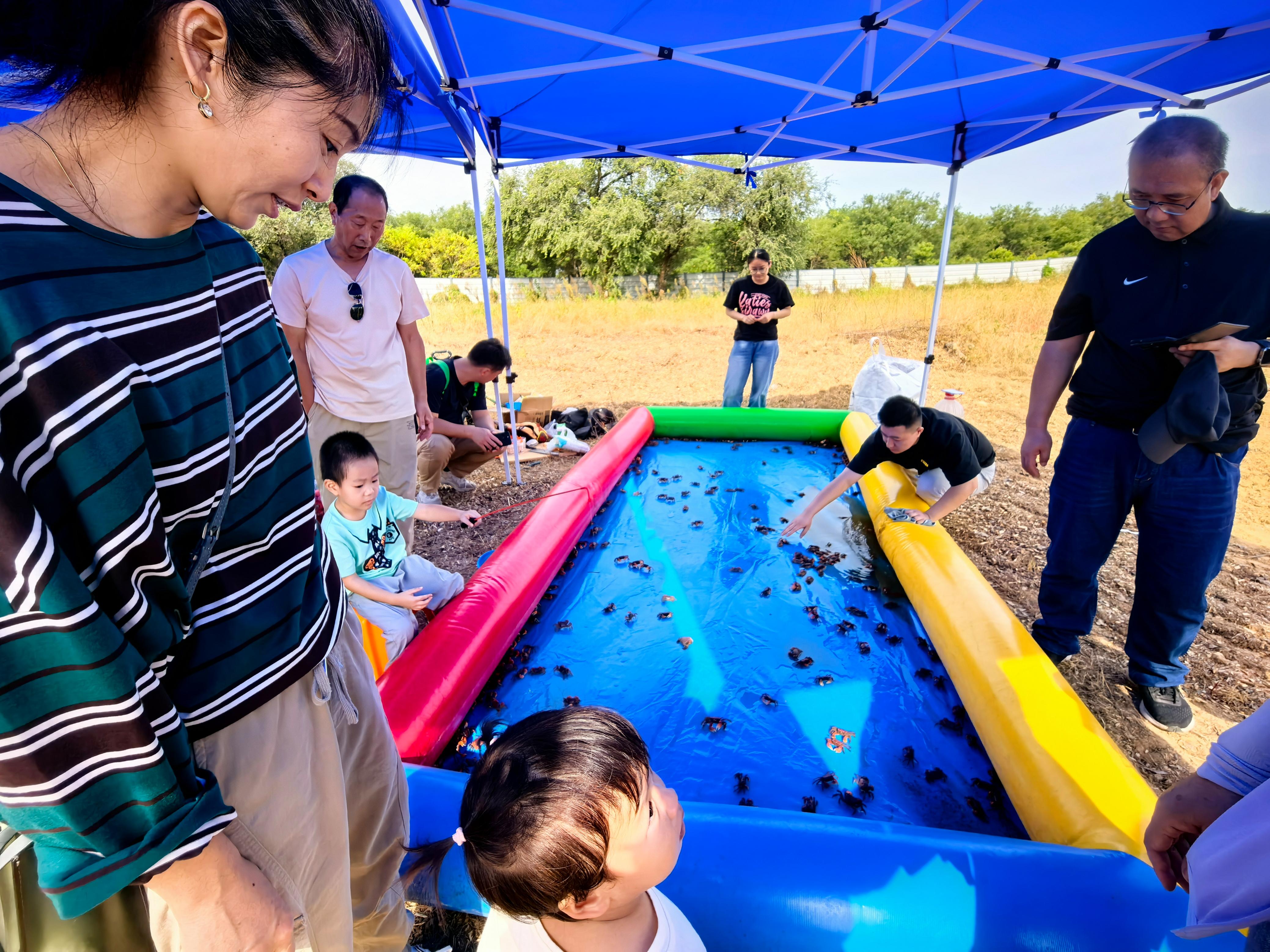 除了造型吸睛、极具视觉张力的大型稻草动物外,活动现场的互动体验区域同样备受青睐。草坪各处散落着稻草垛沙发为疲惫的游客提供休憩之所,让人在触摸稻草自然质感的过程中尽享闲适时光;巨型草帽打卡点则凭借假日风造型与周边稻草景致的巧妙融合营造出满溢的秋日韵味,吸引着诸多游客驻足打卡拍照;场地里孩子们骑着小马驹在场内自由奔驰、在搭建的池边举着简易钓竿收获一个个“战利品”小螃蟹……稻草森友会现场,秋日之景与假日之乐在此汇聚。