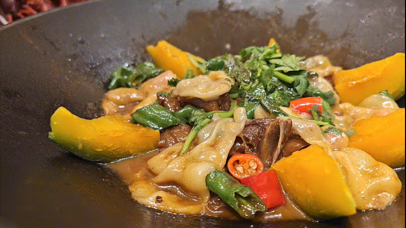 铁锅边布着金黄的南瓜