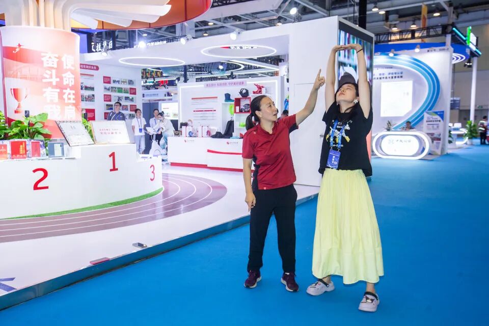 我校展区展出了丰富的实物、视频、资料。值得一提的是,学校特邀世界武术冠军、中国传统养生健身推广者刘晓蕾教授进行八段锦现场教学与互动展示,吸引大量观众跟随体验。同时,展区设置了体育科技互动体验区,可现场通过3D打印技术快速生成个性化运动头盔,直观展示尖端科技在运动装备定制和运动安全防护领域的创新应用。学校研发的“智能跑步评估诊断系统”也向公众开放体验,通过先进的传感技术和人工智能算法,为参与者提供实时运动分析、运动损伤风险评估和个性化改善建议。我校展区吸引了大批观众打卡展区,其中不乏世界冠军、专家学者和体大校友。
