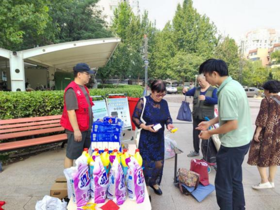 随着志愿者们一声“活动开始啦”,广场瞬间热闹起来。现场分区清晰明了:可回收物兑换处的货架上,洗手液、香皂、纸巾等实用好物一字排开,居民们踮着脚查看兑换清单,不时和身边邻居交流“你这袋旧书能换两包纸巾呢”。身着红马甲的志愿者穿梭在各个区域间,有的帮老人拎重物,有的耐心解答“这个旧手机算不算废旧电子产品”,红色身影成了广场上最暖心的点缀。