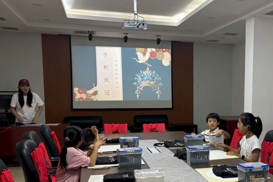 同日举办的“凤冠形制探秘与传统绘画创作”活动,则带领孩子们走进传统美学的殿堂。华丽璀璨、工艺精湛的凤冠影像资料瞬间吸引了孩子们的目光。在创作环节,小朋友们充分发挥想象力,运用彩铅与金属笔绘制出各具特色的凤冠设计图,在艺术创作中提升审美能力与创新思维。