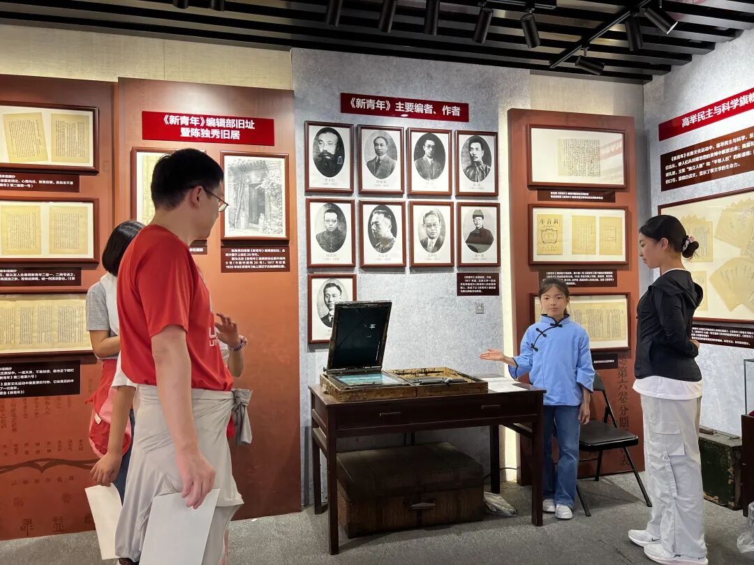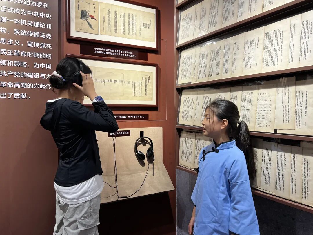 在“亢慕义斋”读书会活动中,讲解员带领观众逐字研读《新青年》中的经典篇章,从“民主与科学”的呐喊到“觉醒与担当”的呼唤,字句间的爱国热忱感染着在场每一个人。朗读间隙观众们分享对《新青年》到新时代青年的精神传承的见解,仿佛重现了百年前青年知识分子追求真理、心系家国的热烈场景。不少家长特意带孩子前来,“让孩子在文字里触摸历史的温度,这种润物细无声的教育,比千言万语的说教更有力量。”