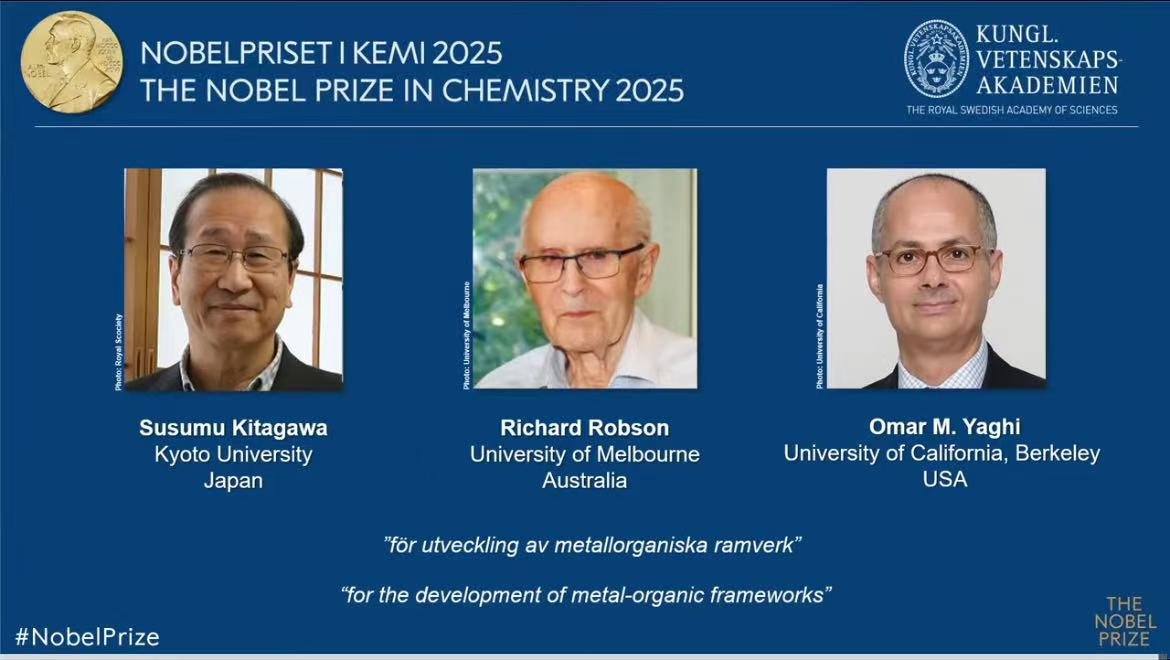 瑞典皇家科学院10月8日宣布,将2025年诺贝尔化学奖授予北川进、理查德·罗布森和奥马尔·M·亚吉,以表彰其“在金属有机骨架领域的贡献”。