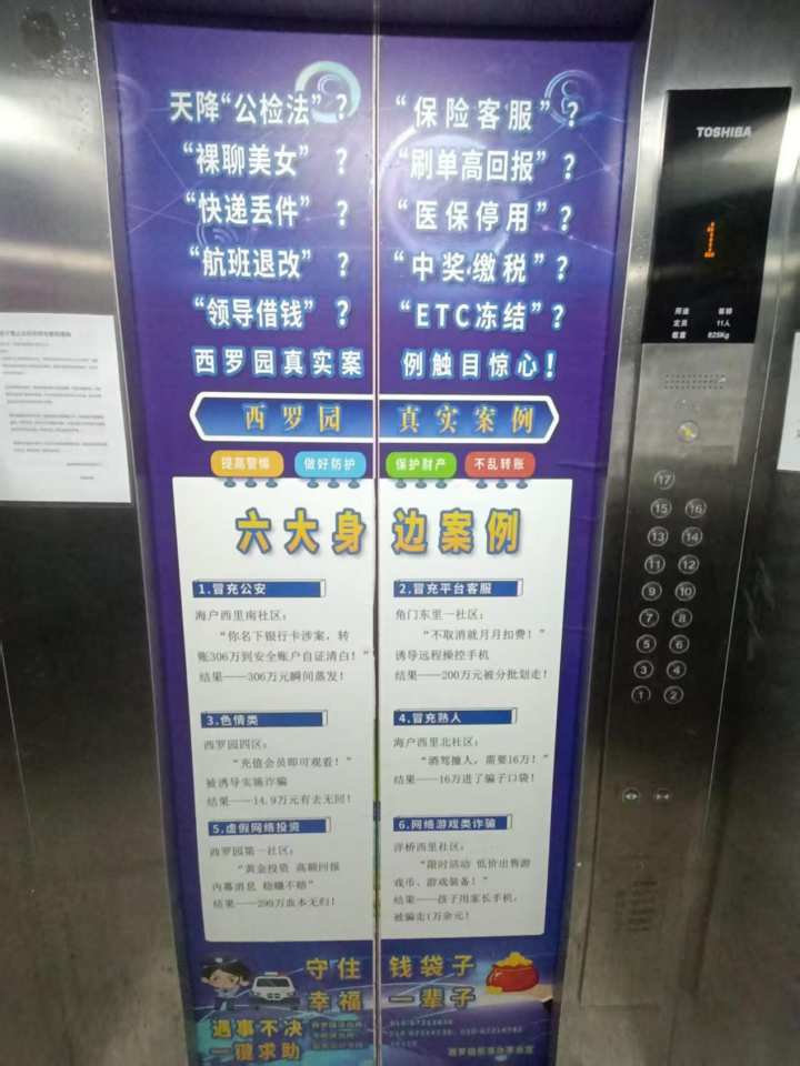 与此同时,街道结合辖区真实案例,设计、制作了反诈宣传海报,在辖区所有居民楼高层电梯门进行张贴。海报中“六大身边案例”层层揭开诈骗分子的伪装套路,还附上了辖区派出所的报警电话。“我们特意选在高层电梯贴,就是考虑到居民等待电梯时能多看几眼,把反诈提醒融入日常生活。”街道工作人员介绍,目前已完成93栋居民楼,267部电梯的海报张贴,覆盖居民超4.6万人。