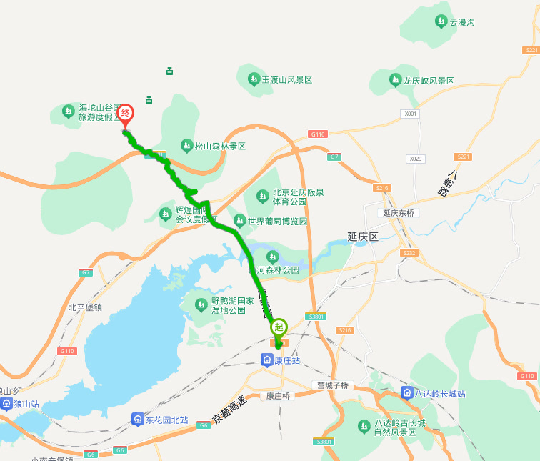 该路线起始于延庆区康庄镇,途径康张路、松闫路。游客可以在八达岭长城周边登长城赏红叶之后,沿着G6辅路继续向西行驶即可到达本路线的起点,沿着路线前行会经过新中国成立后建立的第一座大型水库—官厅水库,秋水与红叶交相辉映,踏上游山玩水之旅,尽享秋日自驾乐趣。路线周边还有野鸭湖湿地公园、北京世园公园、北京延庆奥林匹克园区等知名景点,游客可以通过康野路、康草路、百康路等路线的连接前往景区赏秋游玩。