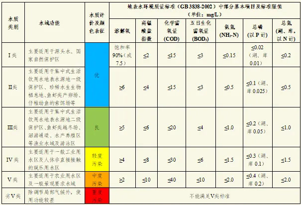 注:① 国家《地表水环境质量标准》(GB 3838-2002)中集中式饮用水水质标准指标109项,其中,基本控制项目21项,此表列出了常用的7项。②根据环保部《地表水环境质量评价办法(试行)》,不能满足《地表水环境质量标准》Ⅴ类的称为劣Ⅴ类。③根据环保部《地表水环境质量评价办法(试行)》,总氮不作为日常水质评价指标,仅在必要时作为参考指标单独评价。