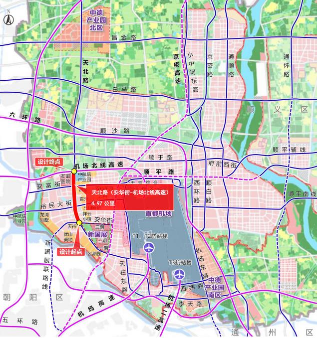 天北路串联顺义、怀柔两区,是本市东北部一条重要南北向交通干道,通过东西向顺于路、怀长路可联通未来科学城与怀柔科学城。天北路(安化街-机场北线高速)段作为串联首都机场、新国展、中德产业园及友谊医院等重要组团及功能区的关键通道,随着新国展二期投用及友谊医院正式开诊,现状双向四车道已无法满足通行需求,高峰时段交通拥堵严重,亟需提升改造。