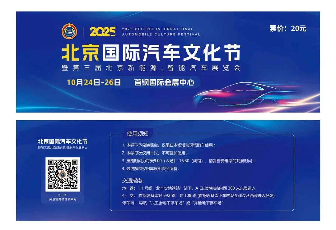 由北京市商务局指导、北京市汽车流通行业协会主办、北京京惠展览服务有限公司承办的2025北京国际汽车文化节暨第三届北京新能源·智能汽车展览会于10月24-26日在石景山首钢国际会展中心即将重磅登场!