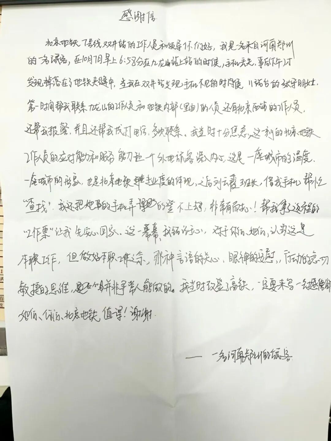 “这是一座城市的温度,一座城市的形象,也是北京地铁专业度的体现……这一幕幕,我铭记于心。”10月8日下午,一封感谢信送到了北京地铁7号线双井站。写信的外地乘客刘先生,用文字记录下前一天自己手机丢失后,地铁工作人员全力协助找回的全过程,字里行间满是感激。
