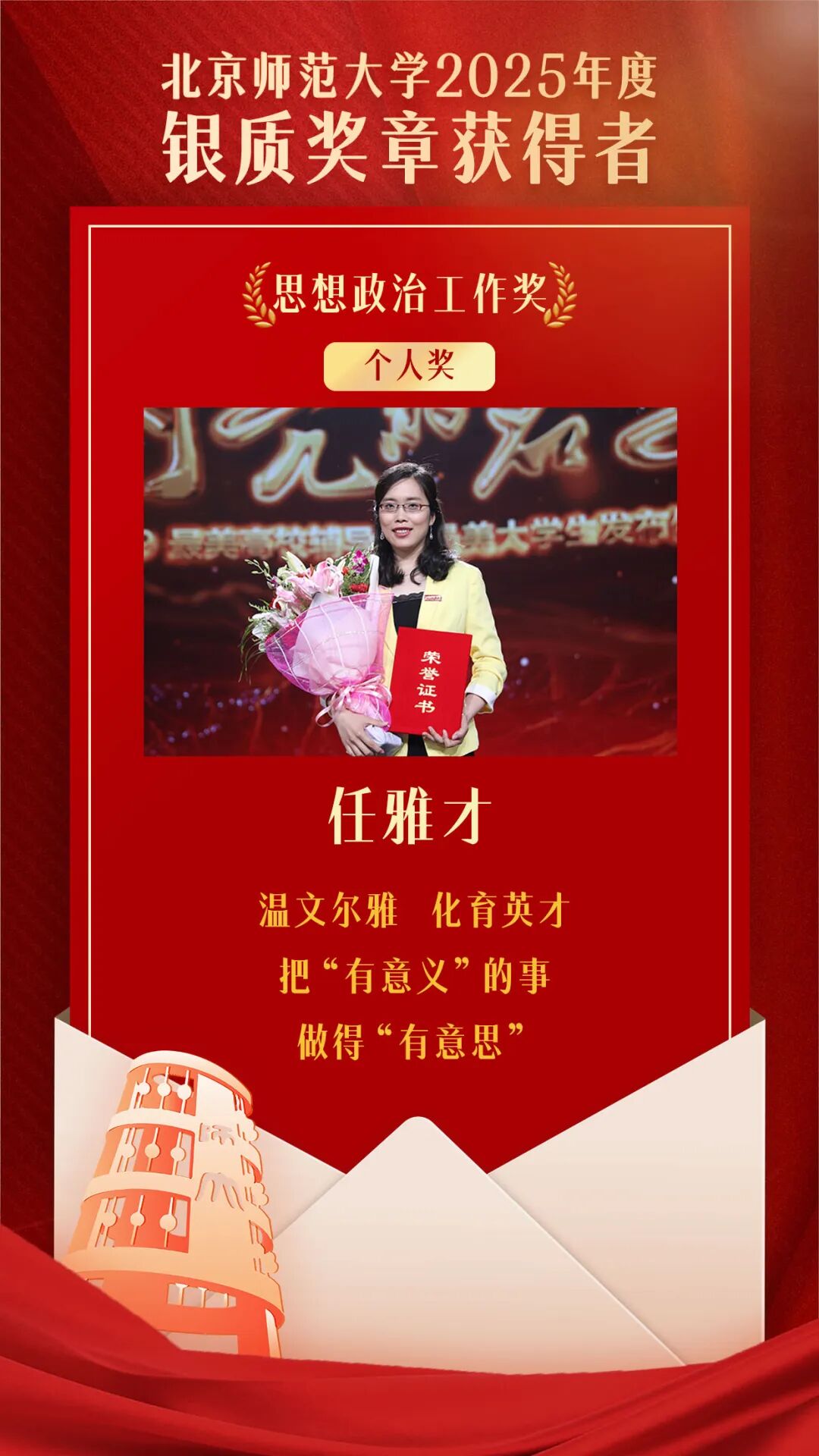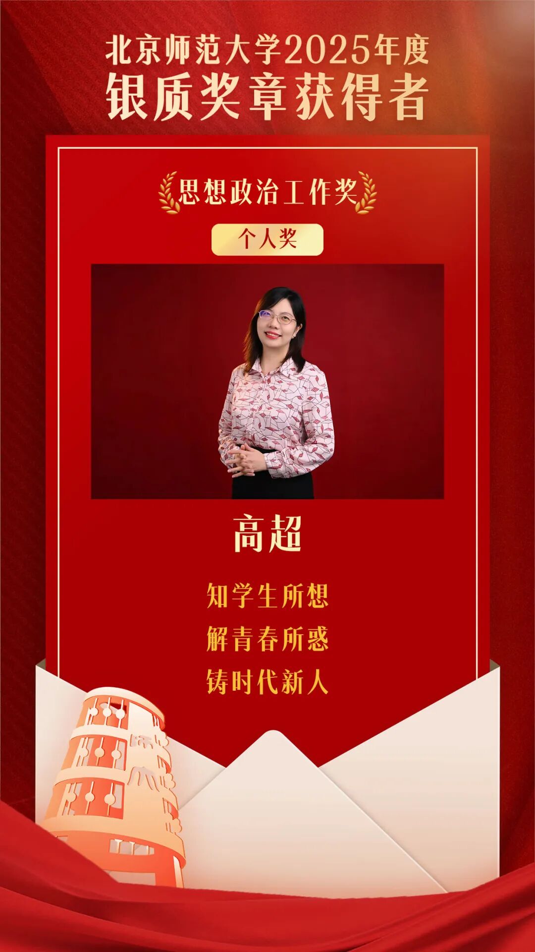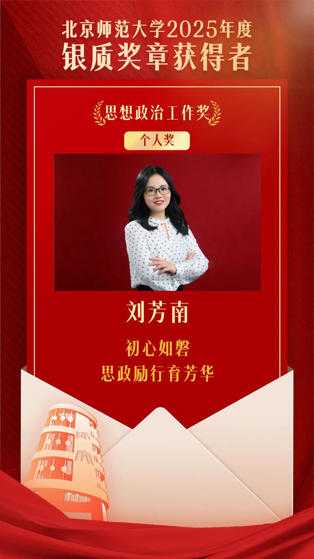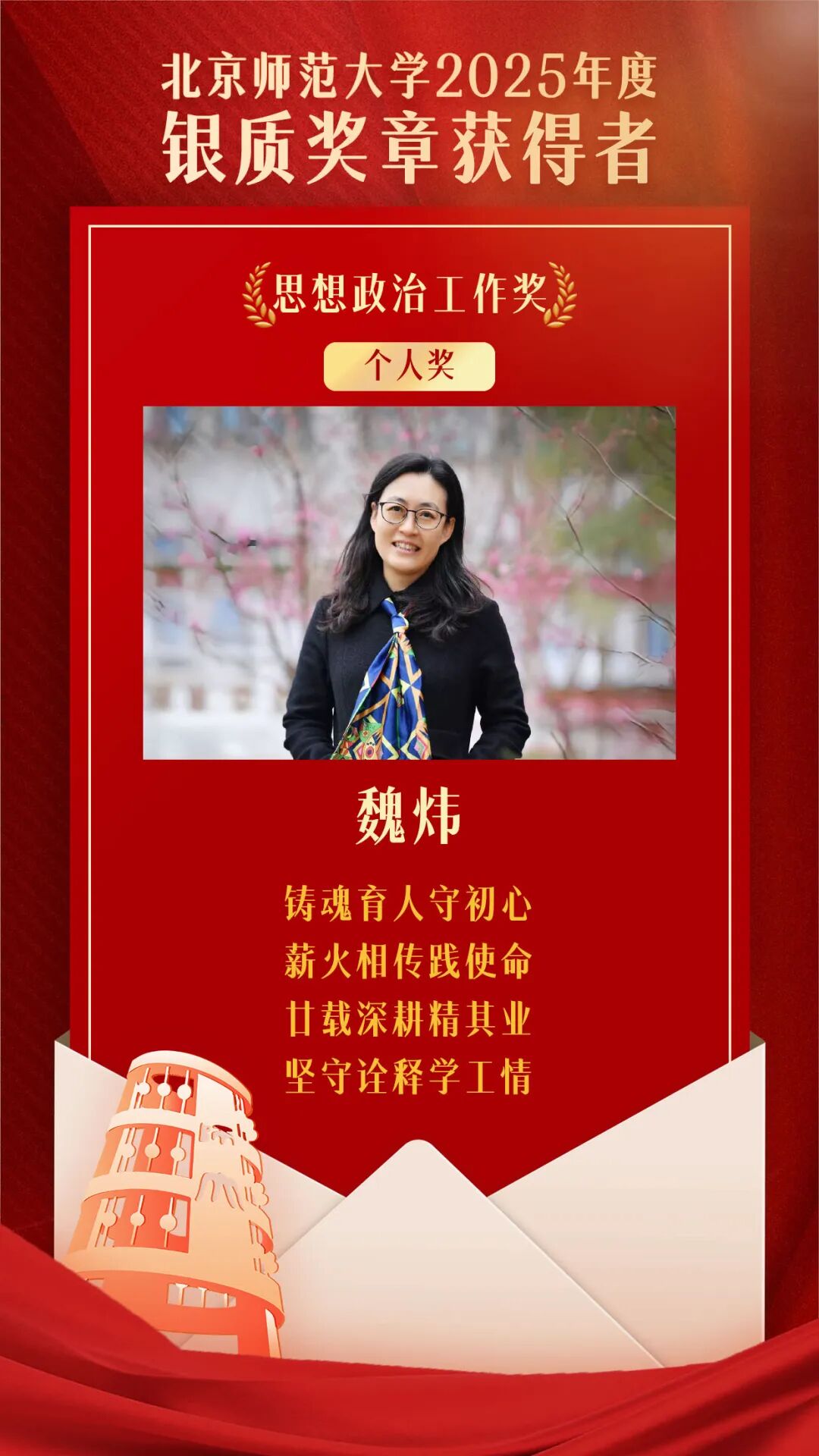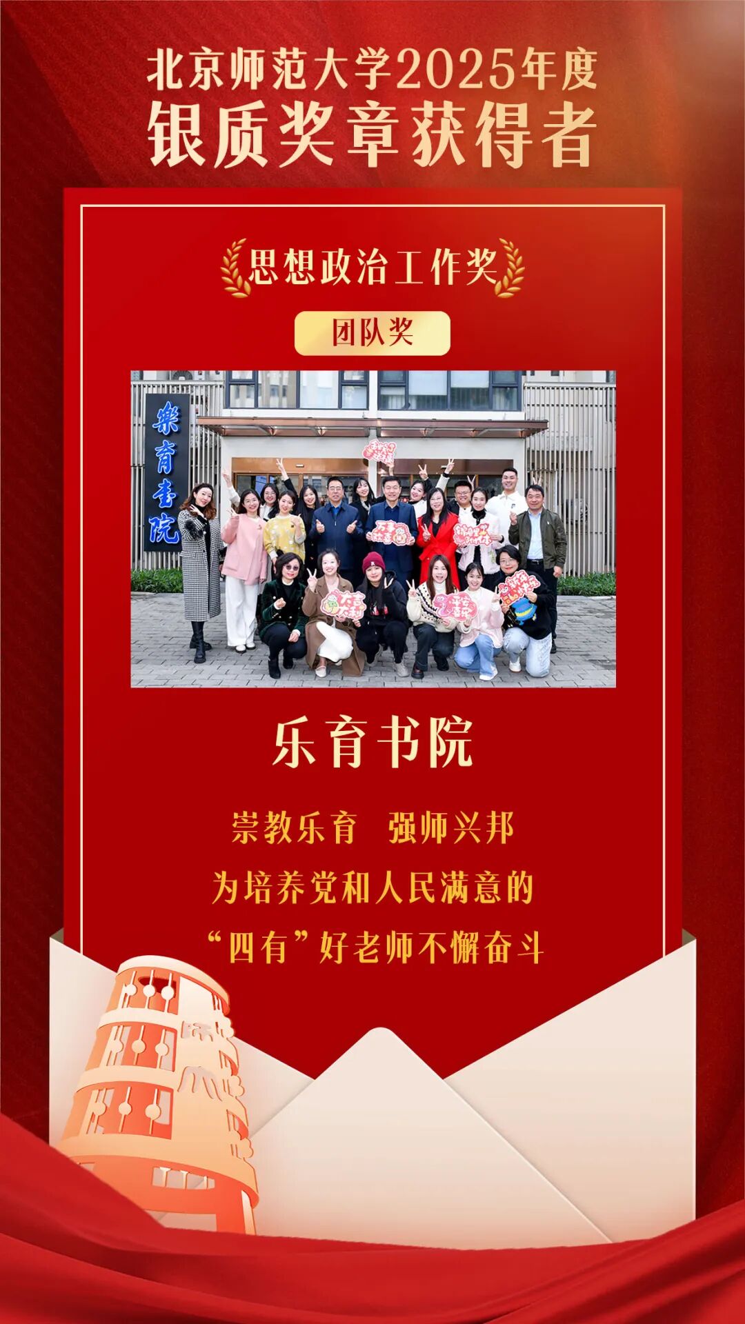 为深入贯彻落实习近平总书记“四有”好老师重要讲话精神和给我校“优师计划”师范生重要回信精神,认真落实学校第十四次党代会精神,激励广大教职员工立足岗位、长期奉献、追求卓越,争做新时代“四有”好老师,北京师范大学组织开展了2025年度银质奖章评选工作。
