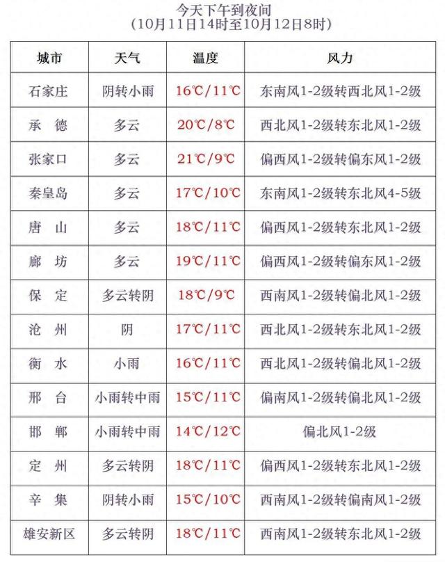 今天傍晚到夜间,石家庄、沧州及以南地区阴有小雨,其中邢台大部、邯郸有中雨到大雨,其他地区多云。最低气温,张家口北部、承德北部0~5℃,其他地区6~13℃。