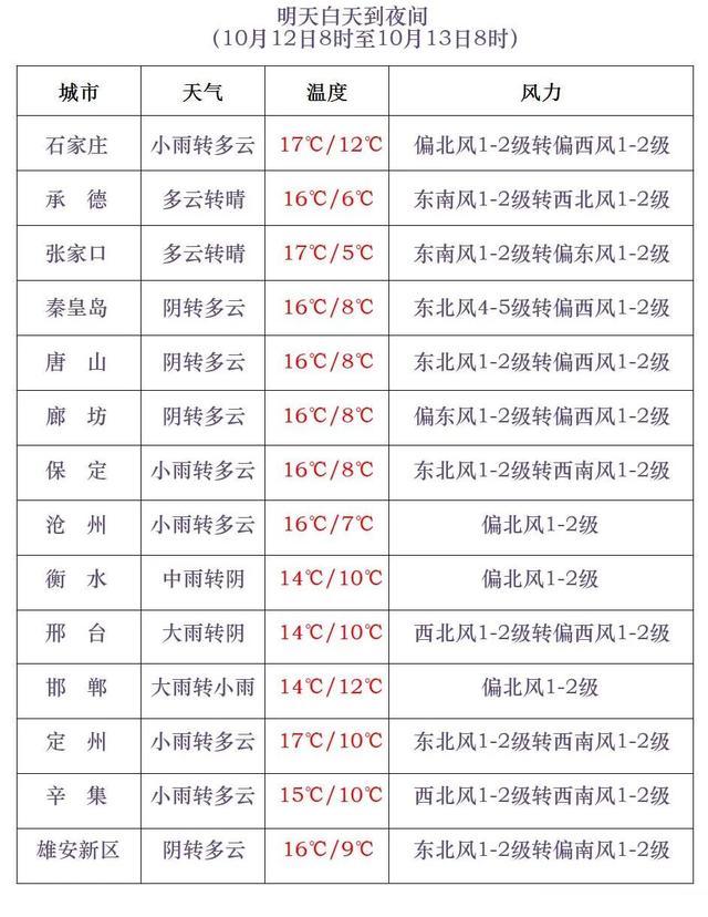 明天白天,保定、廊坊以南地区阴有小雨到中雨,其中衡水南部、邢台、邯郸有大雨,其他地区多云。最高气温,全省12~19℃。