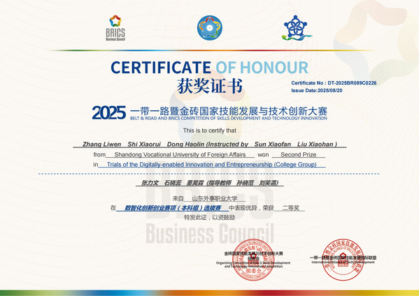 近日,2025“一带一路”暨金砖国家技能发展与技术创新大赛之数智化创新创业赛项全国选拔赛圆满落幕。山东外事职业大学学子凭借扎实的专业素养、突出的创新能力与卓越的团队协作精神,在全国众多参赛队伍中脱颖而出,斩获二等奖1项、优秀奖3项。其中,荣获二等奖的团队成功晋级全国总决赛。