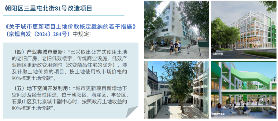 单独设置政策应用情况章节。对应项目权属情况、规划情况、更新方式,标明应用政策具体条款,帮助市场主体找到政策的核心要点,明确操作路径。例如,在城市更新项目土地价款核定方面,朝阳区三里屯北街81号改造项目,地上用途转化按土地使用权市场价格90%核定,地下经营性空间按政府土地收益80%核定,目前该项目已申请办理补充协议,并完成地价评估评审工作。