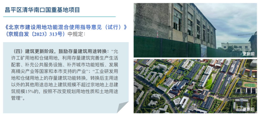 在城市更新项目用地混合配置方面,昌平区清华南口国重基地项目,由工业用地转化为工业研发用地,配建了约12%的办公用房、接待中心、食堂、学生公寓、博物馆等;另外,园区用地还兼容部分市政设施,项目配套设施总规模不超过15%。