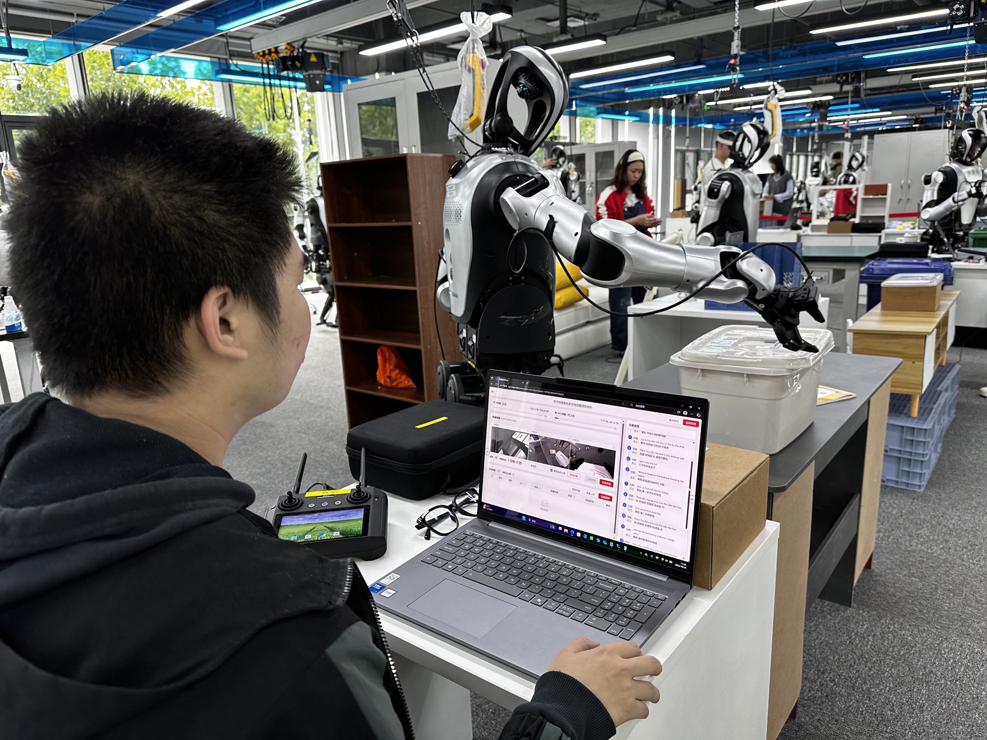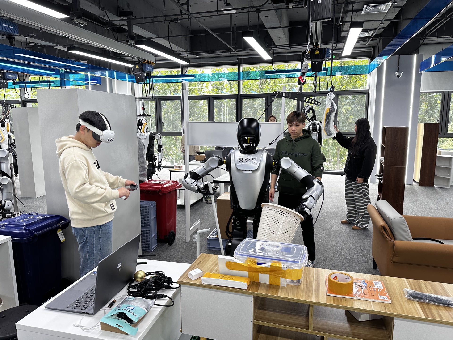 在家庭生活场景的清洁整理操作台前,一台人形机器人在训练师的操作下,正忙着将桌上的充电线一一放进收纳箱中,完成后盖上盖子,放回收纳柜。收纳数据线时,机器人还会碰上一些干扰选项,如盖在数据线上面的图书,机器人需要挪开书本,然后完成收纳,从而更真实还原家庭生活中的场景。