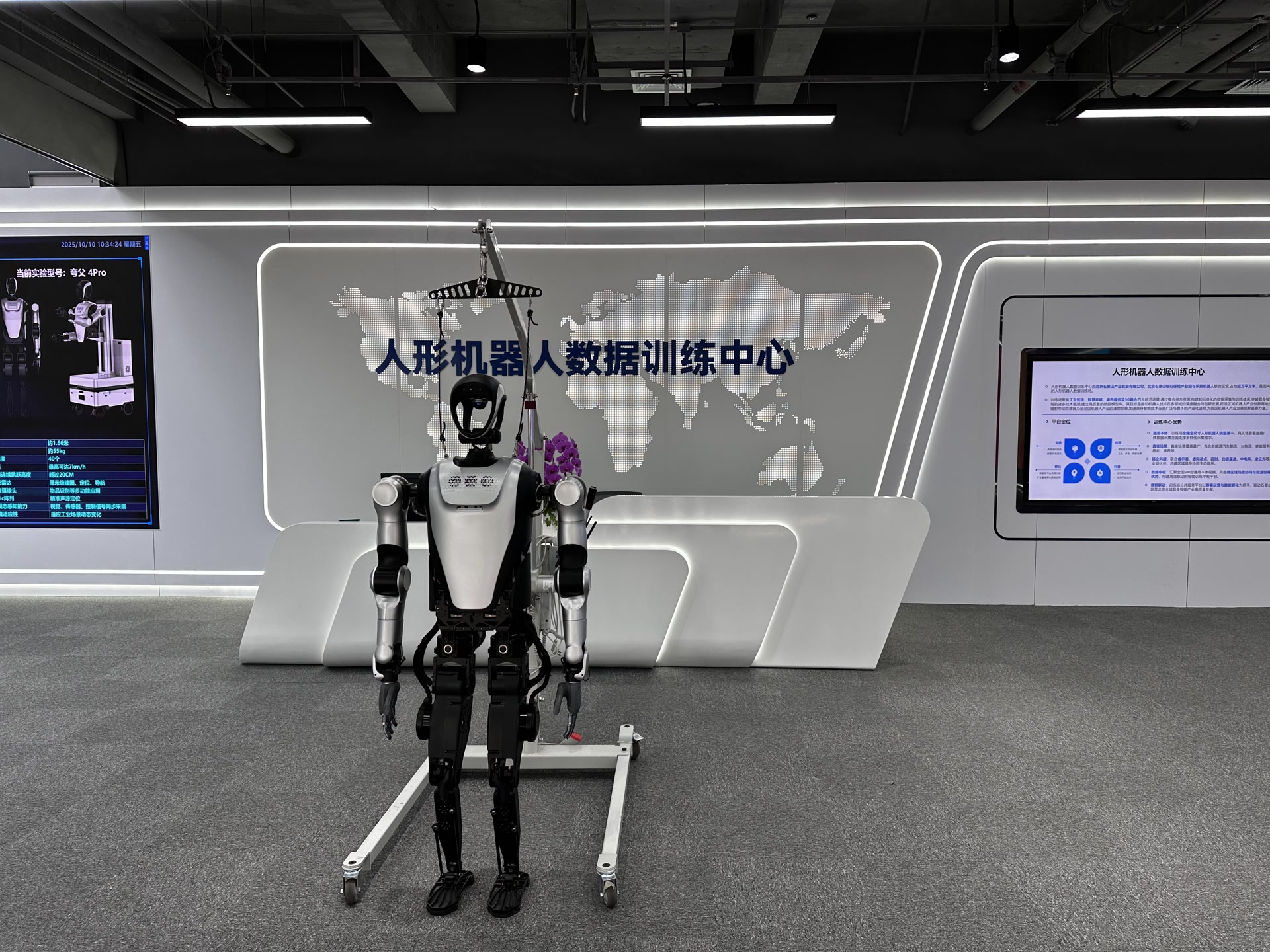 现场,接受训练的机器人名叫“夸父”,是由乐聚机器人公司开发的一款主要面向工业应用场景的人形机器人,它的身高1.66米,体重55公斤,行动灵活、姿态平稳。在它的头部以及左右手,各装有一颗摄像头,现场收集的数据主要来自这些摄像头记录下来的机器人运动轨迹。