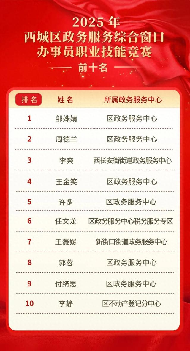 2025年西城区政务服务综合窗口办事员职业技能竞赛(暨北京市职工职业技能大赛政务服务综合窗口办事员竞赛西城区初赛)已圆满收官。经过理论知识考试、技能实操考核两个环节比拼,最终产生10名“服务能手”晋级全市竞赛。