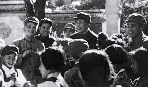 ▲1949年4月,毛泽东、朱德在香山接见出席中国新民主主义青年团第一次全国代表大会的全体代表。图为毛泽东、朱德在接受少年儿童献花,后排左一为冯文彬。