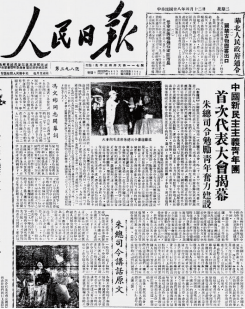 ▲1949年4月12日,《人民日报》头版全文刊载了冯文彬在中国新民主主义青年团第一次全国代表大会上发表的开幕词。