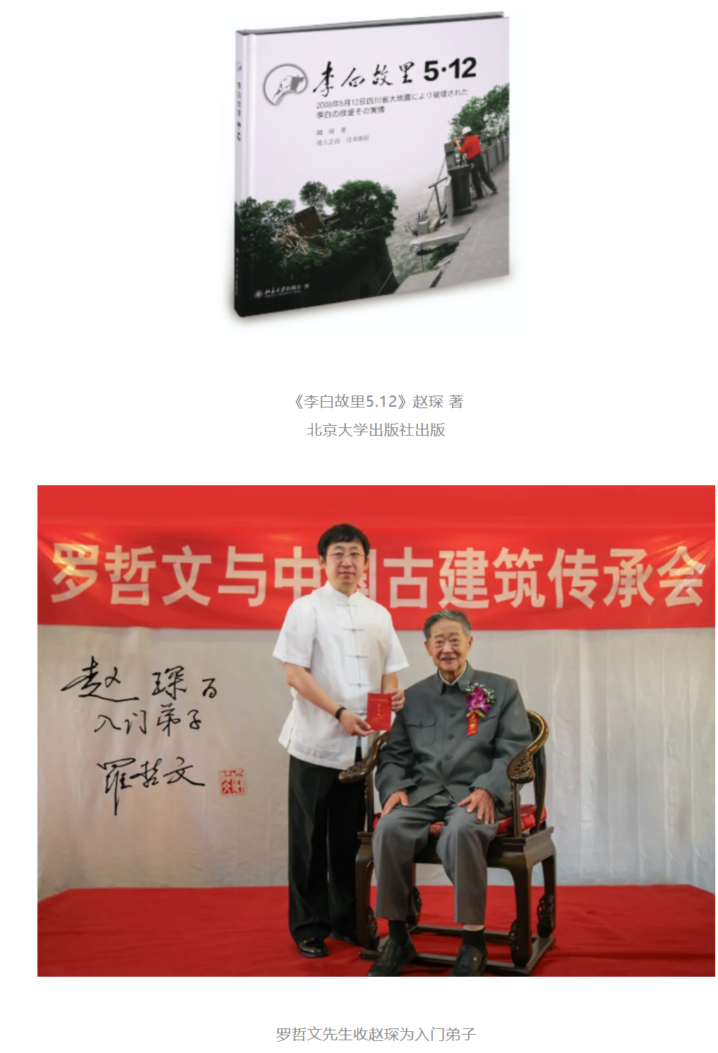 2008年,赵琛出版了《李白故里512》一书,书中将四川地震前后同一地点的古建筑风貌进行对比呈现,留存下珍贵的影像资料。这本书也引起了我国著名古建筑学家、被誉为“万里长城第一人”的罗哲文先生的关注,赵琛有幸成为他的关门弟子,此后,赵琛对长城文化的研究也逐渐深入。