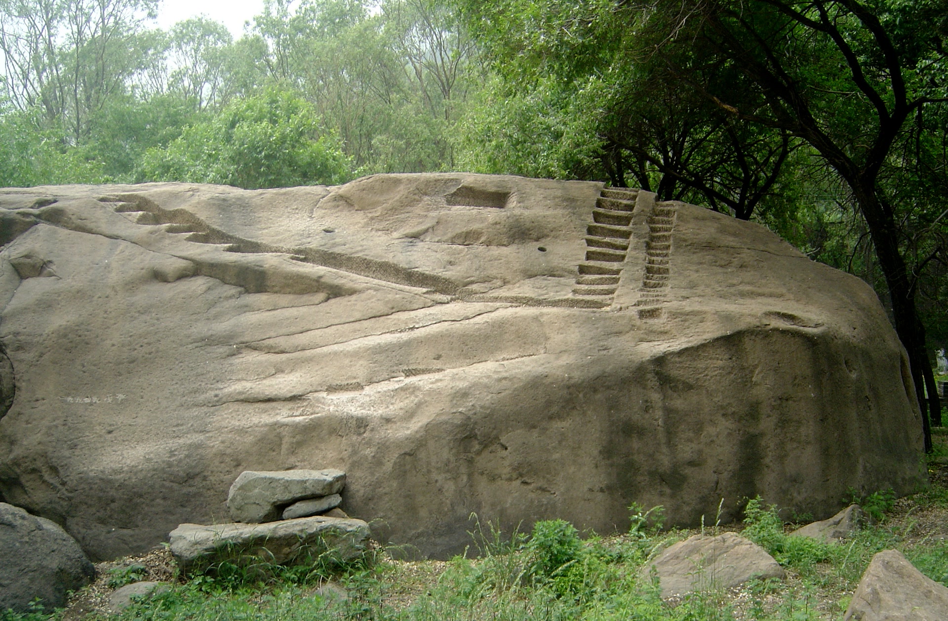 不过也难确定。明朝初年,朱棣数次出关扫北,所以,说那些孔洞是明朝人留下来的,也并非没有可能。不过,孔洞的直径有大有小;那些孔径小的,更像是用机械开凿、可用来插钢管的。20世纪二三十年代,南口居庸关一带打过两次大战。一次是1926年,直系军阀吴佩孚联合奉系张作霖、山西的阎锡山一起攻打冯玉祥的国民军,战事持续了三个月,东北军出动了飞机、坦克。外国记者评论说,战争激烈程度堪比第一次世界大战。再一次是1937年的南口抗战。中国军人用血肉之躯阻挡侵略者的战车近二十天,粉碎了日军“三个月灭亡中国”的狂言。仙枕石上,会不会曾经是国民军和中国抗日部队的前线指挥所呢?